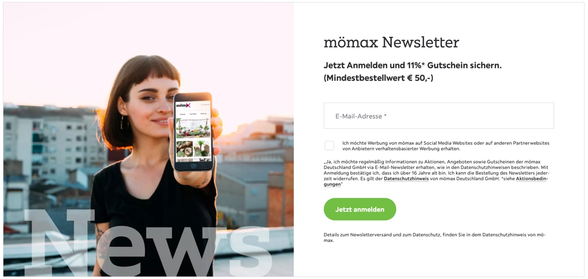 Für den Newsletter können sich sowohl Neukunden als auch Bestandskunden von mömax.de anmelden.